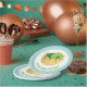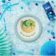 Baby shower supplies paper plates with a newly hatched green baby turtle! The little one has a green baby pacifier in its mouth. White circle and blue background with polka dots pattern. Add your message in space provided.