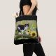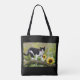 Cute tuxedo cat on a tree branch with sunflowers - tote bag