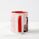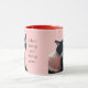 Photo of cute black and white tuxedo cat wearing a pink and white striped dress, with a green bone on it, with the message, When I think of you I think of peace, is printed on two sides of custom mugs. The message can be customised on the template form.