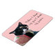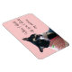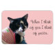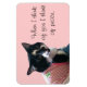 Photo of cute black and white tuxedo cat wearing a pink and white striped dress, with a green bone on it, with the message, When I think of you I think of peace, is printed on flexible magnets. The message can be customised on the template form.
