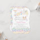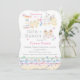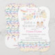 This really sweet Baby Shower invitation for Twin Girls features an illustration of the cutest little baby girls sitting back to back on a swing. The swing is hanging from the colourful word "Twins' which is decorated with flowers, polka dots, and stripes. In-between the letters of the word "Twins" are tiny animals, and lying across the back of the letter "S" is a cute little clown. A pattern of colourful safety pins and a repeat of the word "Girl" fills the bottom of this adorable invitation card, and the same pattern also covers the back. Original artwork by Carol M.Kearns.