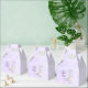 A favour box with a cute illustration featuring a grayish purple dinosaur.