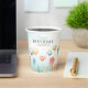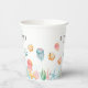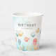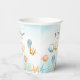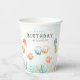 Ocean themed birthday party paper cups featuring watercolor tropical fish, starfish, jelly fish and sea plants, the saying "happy birthday", and the childs name.