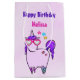 Gift bag with a whimsical drawing of a cool and funky pink cubby unicorn which has a purple mane and tale. This cute creature is wearing heart-shaped sunglasses and is decorated with little stars. Pink watercolor background.
