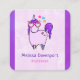 Square business cards with a whimsical drawing of a cool and funky pink unicorn which has a purple mane and tale. This cute creature is wearing heart-shaped sunglasses and is decorated with little stars. Pink watercolor background with a bright purple border on the left and right sides.