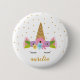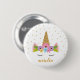A button with a cute magical unicorn with pastel flowers and glitter horn adorned with glitter confetti.