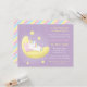 A sweet unicorn themed baby shower invitation in pastel colours over a girly purple background. Design features a cute little white unicorn with pastel red, yellow and blue mane sleeping blissfully on the crescent moon. Strings of stars watches over the little creature. A magical and fairy tale touch for moms to be who are expecting baby girls!