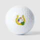 An illustration of a cute white unicorn with rainbow hair on a golden horse shoe with a green shamrock clover leaf for St. Patrick's Day. This beautiful fairytale and magical animal design is a gift idea for whimsical lovers and good luck charm lovers.