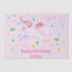 NewParkLane - Personalised kids birthday tissue paper featuring a cute unicorn, with whimsicial colourful stars, flowers and hearts, against a blush pink background, and a happy birthday wish, and text template for a name.