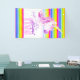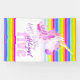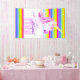5th birthday party banner, featuring a cute whimsical unicorn watercolor painting and colorful rainbow stripes. Personalize with your own birthday party details, currently reads, Abigail is turning five. Gallop on over. Unique drawing, watercolor painting art and graphic design by Sarah Trett www.sarahtrett.com for www.mylittleeden.com