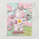 An adorable pink unicorn in PJs has her morning coffee and an egg as she tries to wake up and get ready for a new day with pink clouds and a castle in the background