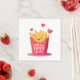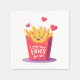 A cute and colorful cartoon illustration of a red French fries carton with a happy kawaii smiling face. The design features a floating red heart and the romantic funny pun quote "I only have FRIES for you". The image has a white sticker border, making it perfect for Valentine's Day greeting cards, fast food lovers, and humorous romantic gifts. Isolated design.