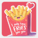 A cute and colorful cartoon illustration of a red French fries carton with a happy kawaii smiling face. The design features a floating red heart and the romantic funny pun quote "I only have FRIES for you". The image has a white sticker border, making it perfect for Valentine's Day greeting cards, fast food lovers, and humorous romantic gifts. Isolated design.