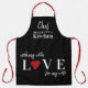 Personalised cooking with love for my wife Valentine's Day gift apron for a great cook husband with modern typography and a red heart over a black background.
