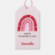 Cute Valentines sticker features rainbow in red and pink decorated in hearts on pink gift tags.