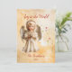 A charming vintage porcelain child angel is pictured on a cream and gold watercolor background with a sprinkle of Christmas stars. "Joy to the World" is in contrasting red script that you can change if you want to. Be sure to edit the family name and year to your own choice. On the back a little cameo image of our angel appears again.