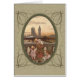 Vintage illustration of four children and a dog overlooking Big Ben from London bridge, Image is enclosed in a vintage style frame featuring a calligraphy scroll pattern designed by oldeworld gifts. Image plate first published circa 1889