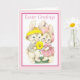 This greeting card features a vintage illustration of a pair of cute Easter bunnies with a pink border. The greeting on the front, in pink lettering, is customisable, as is the greeting inside.