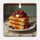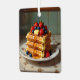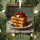 A Christmas ornament with a waffle theme. The front has a stack of yummy waffles on an antique vintage plate topped with strawberries, blueberries, butter and maple syrup. Back has a cute waffle and Christmas pun that says, "Have a waffly jolly Christmas!