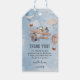 Cute Aviation Birthday Boy Thank You Gift Tags! Design features a blue watercolor sky background with little stars and fluffy clouds, a little boy flying a vintage aeroplane, hot air balloons, and a thank you template that is easy to customise.