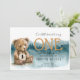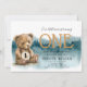Our little bear cub is turning one first baby birthday invitation. Brown and dusty blue hues. Bear holding wood stump with number one! Pretty whimsical soft watercolors that are great for gender neutral invites for both boys and girls. Dark blue on the back of the invite.