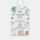 Cute Baby Boy Baby Shower Thank You Favour Tags. Featuring a classic white background, a border of sweet little baby boy nursery clothes, wooden toys and accessories. Customise your own thank you message to make it personal to you.