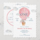 Personalised, Pink and white One year Baby's Birthday card with watercolor illustration of cute Bunny Rabbit in hot air balloon.
