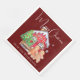 This custom Christmas holiday party napkin features a cute watercolor style illustration of gingerbread people. A little gingerbread man and lady are standing in front of their colourful gingerbread house. A pretty decorated tree is on the left. The background is a rich burgundy colour.