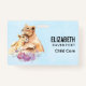 A name tag with a cute watercolor painting of a mother lion holding her baby cub. A pretty purple floral bouquet below them, adds a gentle touch to this sweet and adorable image. Light blue background.