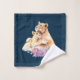Towel set with a cute watercolor painting of a mother lion holding her baby cub. A pretty purple floral bouquet below them, adds a gentle touch to this sweet and adorable image. Dark blue background.
