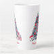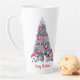 A cute latte mug in shades of red, black and grey. The design which is featured on both sides shows a watercolor illustration of a penguin sleeping under a Christmas tree. Merry Christmas is in a red handwritten script