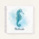 Personalise this underwater themed notebook featuring a cute watercolor seahorse on a splash of ocean wave.