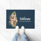 Welcome door mat with a cute watercolor design featuring a cute sloth hanging onto a tree branch surrounded by green tropical leaves.