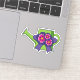 An illustration of a cute apple green watering can with violet bouquet of flowers and ribbon. This colourful design is a gift idea for gardening lovers, summer season lovers, valentines day, and floral lovers.