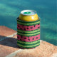 Can cooler with a cute watermelon pattern. Green rind in layers of stripes along with a layer of pink stripes with black seeds inside.