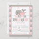 Modern whale baby shower invitation featuring a cute mum whale with baby set on a pink & light grey brown stripe background with an anchor accent and pendant banners. Flip our girls baby shower invite over to view a matching back for an extra special touch. Perfect for a nautical themed little baby girl shower.