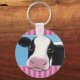 Cute whimsical cow keychain. Our keychain designs make the perfect gift or stocking filler for any cow lover! Artwork features a sweet faced black and white cow with brown eyes peering over pink stripes. Artwork © Lisa Marie Robinson. All Rights Reserved.