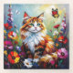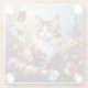 This coaster has a cute whimsical colorful folk art cat sitting in flowers and surrounded by butterflies done in an impasto style.
