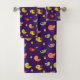 A towel set with a pattern of hand-drawn whimsical birds. Cute little green pine trees between them. Dark purple background.