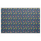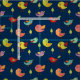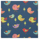 Fabric with a pattern of hand-drawn whimsical birds. Cute little green pine trees between them. Dark blue background.