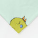A blanket with a pattern of hand-drawn whimsical birds. Cute little green pine trees between them. Mint green background.