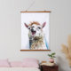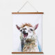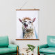 Cute white alpaca singing through microphone hanging tapestry