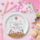 Cute whimsical white mouse with pink balloon in a field of flowers baby shower party paper plate with customisable name and message.