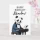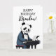 A tuxedo-wearing panda seated at a grand piano, performing for a birthday celebration.