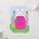 A very cute Easter Egg Hunt Invite featuring an adorable white rabbit, peeking out over a giant pink Easter egg. The egg is framed by smaller Easter eggs and there is a trail of bunny paw prints along the bottom. All text details can be customized to suit. The back features a cute sign post saying, "Bunny Crossing" and there is a small bunny peering out of a rabbit hole on the grass below, with more Easter eggs nearby.