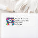 Adorable return address label featuring a cute, whimsical, white cartoon kitty cat with big blue eyes, pink ears and wearing a bright colourful collar. She has a cute blue, pink and white striped tail and a blue stripe on her head. The background is mostly purple with planets, clouds, stars and flowers in a mix of bold, bright, vibrant colours. Ideal for anyone who loves cats and space.