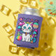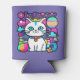 Adorable can cooler featuring a cute, whimsical, white cartoon kitty cat with big blue eyes, pink ears and wearing a bright colourful collar. She has a cute blue, pink and white striped tail and a blue stripe on her head. The background is mostly purple with planets, clouds, stars and flowers in a mix of bold, bright, vibrant colours. Ideal for anyone who loves cats and space.