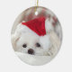 Ornament with an adorable photo of a cute white doggy wearing a red christmas hat.