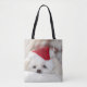 Tote bag with an adorable photo of a cute white doggy wearing a red christmas hat.