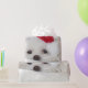 Wrapping paper with an adorable photo of a cute white doggy wearing a red christmas hat.